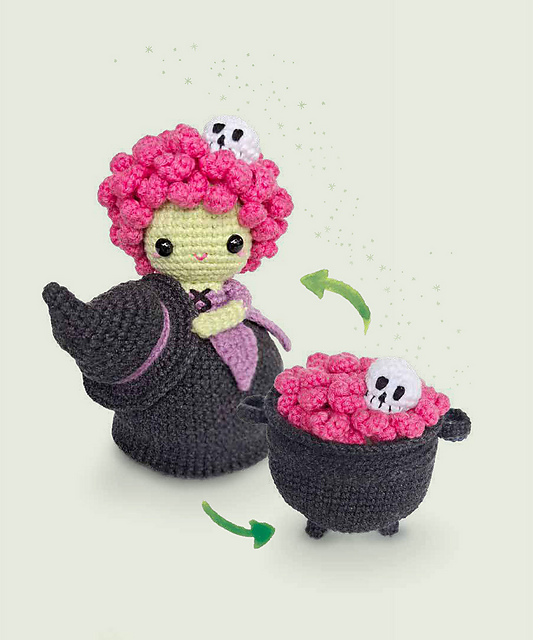 Approximate size: the finished amigurumi is about 13.5 cm / 5.5” tall as a witch (with hat) and 7 cm / 2.75” tall as a cauldron.