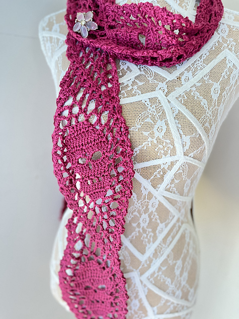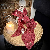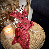 This is my very first skull design, created to bring a touch of boldness to my collection while still keeping the light, airy feel I love in crochet. Each skull sits at the centre of a stepped group of stitches, giving the scarf a rhythmic flow and a striking visual effect. It’s a quick project with just enough detail to keep it interesting, and the finished piece makes a dramatic layering accessory.