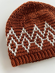The pattern is worked bottom-up, starting with a ribbed brim, followed by a mosaic section worked in the round, and ending with crown decreases using extended half double crochet (ehdc) for a smooth, rounded shape.