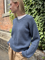 The sweater is worked from top to bottom. The shoulders are created using short rows to provide a more comfortable fit. First, the back is worked flat, with some increases to shape the armhole. The front is then worked with increases to form the V-neck.