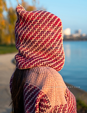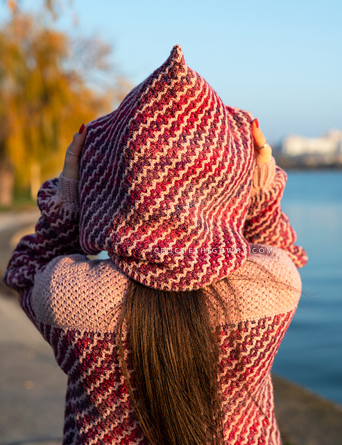 The Wavelength Hooded Cowl is equal parts cozy and playful! A practical accessory that’s perfect for layering and adds just a hint of whimsy to your outfit. What makes this design stand out is its reversible stitch pattern. The waves flow in one direction on one side, then shift course on the reverse, creating a beautiful, mirrored effect where each color takes a turn in the spotlight.