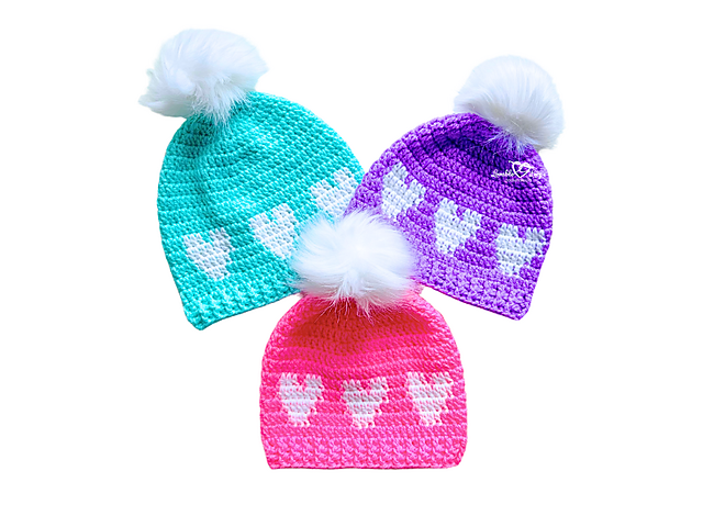 Add a little love to your winter wardrobe with this free crochet heart hat pattern! This cozy beanie features rounds of colorful hearts, a soft ribbed brim, and a playful pom pom on top.