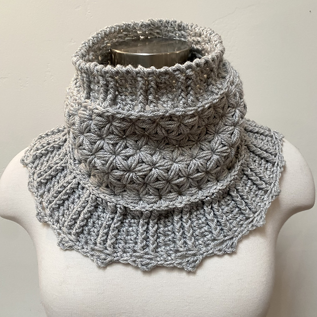 Soft as a winter whisper and delicately textured with the Jasmine stitch, the Whisperfrost Cowl brings together quiet elegance and cozy warmth.