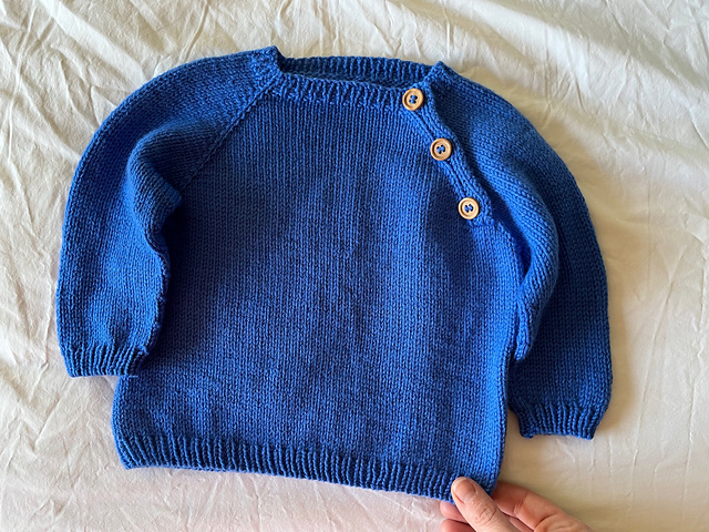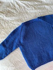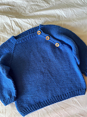 This sweater is knit from the top down with raglan increases. The yoke is initially worked back and forth simultaneously with a button placket along the front left raglan border for easy dressing. Once the placket is complete, the work is joined and completed in the round followed by short rows to raise the back neckline. After the armholes have been shaped, stitches are removed and set aside for the sleeves to be knit later. The body is then completed in stocking stitch with a ribbed edge. The sleeves are then completed in the round and finished with a ribbed edge.
