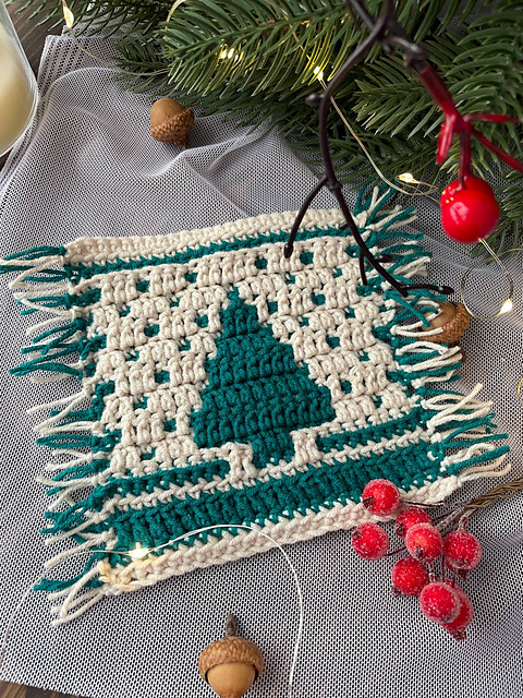 You can use any yarn with a matching hook size, but make sure to choose contrasting colours so your tree design stands out. Try green and cream for a classic Christmas look or gold and white for a modern twist!