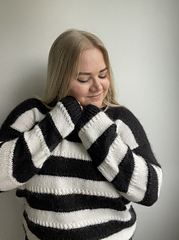 Shadow Lines is a relaxed striped sweater that invites you to explore texture and color. Worked with fingering-weight merino and lace-weight silk mohair held together, it creates a lightweight, drapey fabric that feels luxurious against the skin. Use a single color for a subtle look or dive into your stash for something playful and personal, the possibilities are endless. Choose between a clean V-neckline or a classic round neck or make them both! This sweater is effortless to wear and easy to style. Shadow Lines is written for 10 sizes, and the pattern includes a finished bust range of 84–175 cm / 33–69 inches, with recommended positive ease of 7.5–20 cm / 3–8 inches. This is an ideal sweater for layering or wearing on its own.