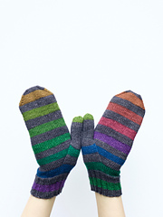 Shown in: Gauge Dyeworks CLASSIC MERINO TWIST (80% Superwash Merino 20% Nylon, 443 yards / 115 grams) in “White Light” for fingerless mitten & “Concrete and Tulips” for full mitten