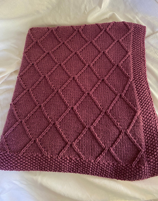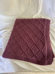 A textured blanket with clean, geometric lines, this pattern will look best knit in a solid or tonal yarn. Due to its simple texture, this pattern is also easily customizable. Make the blanket longer or shorter by adding or omitting rows in groups of 24. Make the blanket wider or narrower by adding or omitting stitches from the center of the blanket in groups of 16.