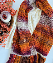 The Chunky Suzette Pocket Shawl is a cozy, textured scarf that works up beautifully in the gradient shades of Prism yarn from Mary Maxim. By holding two strands together, you’ll create a bulky-weight yarn with rich, blended tones that are perfect for fall. The unique colour effects make every shawl one of a kind, giving this piece a handmade charm that stands out.