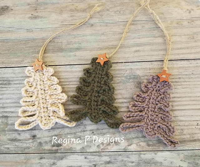 **Work these cute looped trees up quickly with the scraps you have on hand and spruce up your tree or packages with a handmade addition this holiday season. Finished tree should measure approximately 4” tall depending on your yarn of choice and tension.**