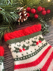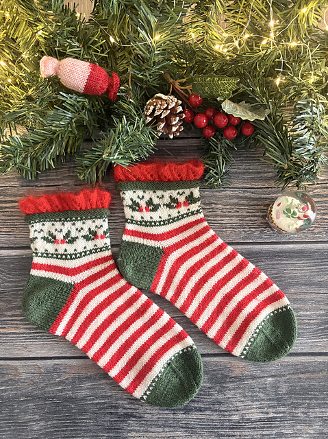 tiene un talón de vueltas cortas shadow wraps muy fácil de hacer. Se teje un bonito dibujo en la caña al cual debe su nombre con la técnica del colorwork o Fair isle y el resto del calcetín se teje a rayas