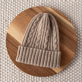 The Gentle Breeze Hat is knit in the round from the bottom up with DK-weight merino wool. The design features a combination of ribbing and simple cables. The pattern is an 8-round repeat. The hat is very stretchy.