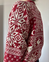 The **Lillehammer Christmas Pullover** is a cheeky, christmassy rendition of the Lillehammer Pullover. It has all-over stranded colourwork, an 80s inspired oversized fit and a dropped shoulder construction. The pattern is calculated to have around 30 cm of positive ease, with large sleeves to complement the silhouette. The entire pullover is knitted in the round and uses steeking to make that possible.