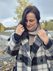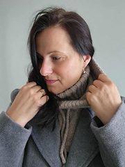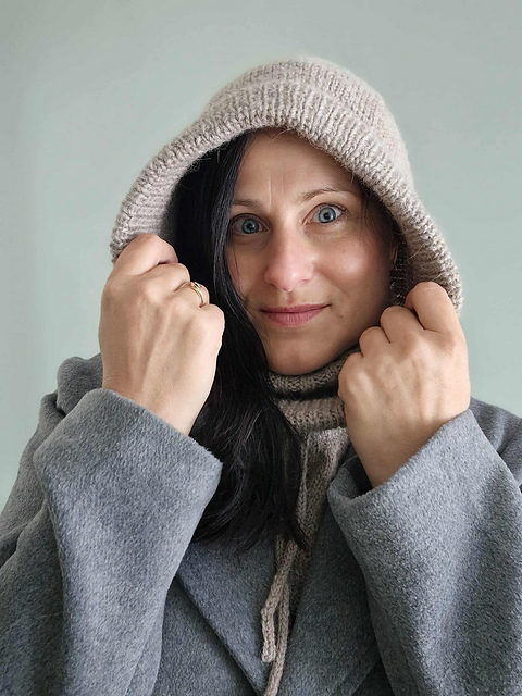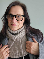 The Whistler Hood is a warm cowl with a spacious hood. The cowl is knitted first in ribbing, fol-lowed by the shoulder section in stockinette stitch. Stitches for the hood are picked up afterward. The hood is knitted back and forth, from the bottom up, in stockinette stitch. It is spacious and features a drawstring casing with a knitted cord.