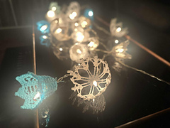 If making lights, then you need fairylights, I like to usethe ones with 10 lights and either clear or white cord. I understand that you can get different types of fairy lights, depending on where you live. Thatโs why I made the pattern so that you can decide on the size of opening at the top of the bells & flowers, so I think any kind of fairy lights should work.