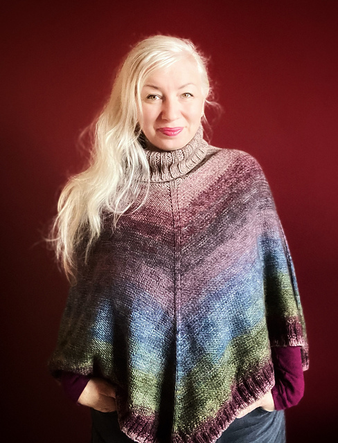 The poncho is knitted inside out, meaning that the reverse stockinette side (the wrong side while knitting) will become the right side when worn, then finished with a 5cm/2” rib border. Yarns are held double throughout: the cowl neck is knitted holding two strands of MC, while mini skeins are added by magic knots and held together to marl the body.