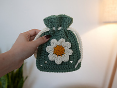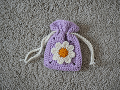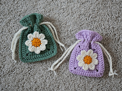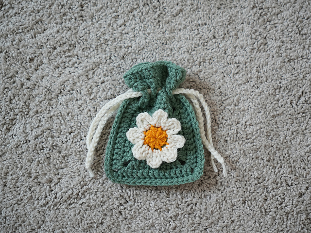 This crochet flower drawstring pouch is made with 2 granny squares and has a drawstring closure. You can make your pouch with a flower on both sides, but I have a solid granny square pattern that will fit perfectly for a plain back! Use this cute crochet pouch to hold smaller things in your bag or to use as a gift bag!