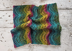 The crochet cowl is made in one long strip with the chevron stitch pattern creating a beautiful texture. The 2-row repeat is simple to follow, and the edges line up neatly for a simple slip stitch joining method.