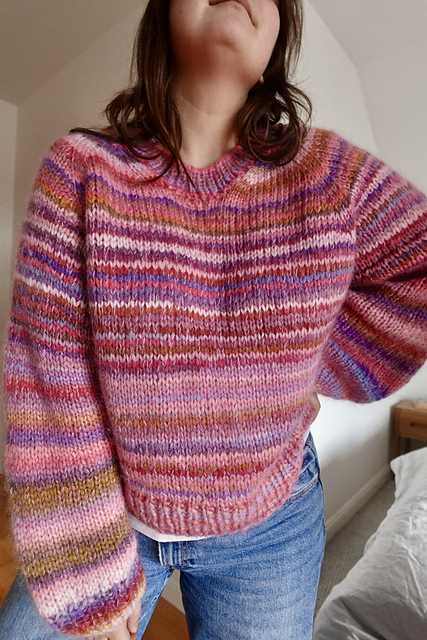 The fit is oversized and cozy, making the Foolproof Sweater a true wardrobe staple. Whether you choose bold stripes or a solid color, this easy knit sweater will quickly become your new favorite piece – handmade by you!