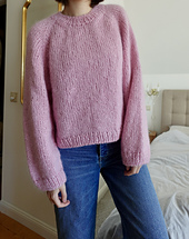 Our pink Foolproof Sweater was knit in: “Promise” (col. 009) and “Mohair Luxe” (col. 148) from Lang Yarns.