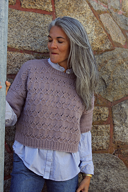 South Carroll Sour is a simple pullover, featuring the square, shortish length sleeves I've been seeing in some of the Fall 2025 collections. I'm loving this paired with a long sleeve blouse, but I also like it worn by itself as a more modern knitted tee.