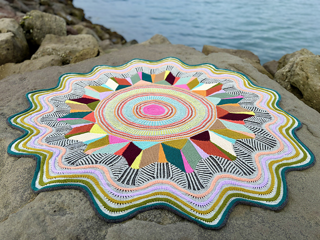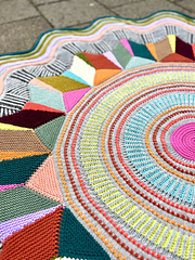 Then stitches are picked up to decrease toward the center of the blanket with tiny bobble stripes and two-color brioche. The border is picked up around the other edge of the geometric color blocked section to knit the briochevron motif. Wavy stripes complete the border for a splashy grand finale.