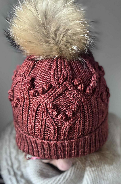 A richly textured hat featuring bobbles, cables, twisted stitches, and an intelligent ribbing that stays beautifully in place. It’s not the easiest project — you’ll need a bit of knitting experience — but it’s absolutely worth the effort. The result is a stunning, dimensional fabric full of character and charm.
