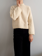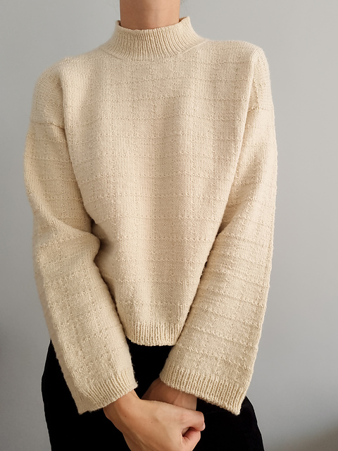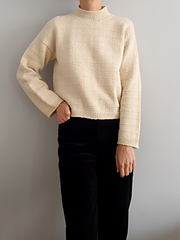 The sweater is knitted in the pattern from the top down, seamlessly. The back is worked first, followed by the shoulders. Once the back and fronts are joined, they are knitted together in the round and finished with a hem in a 1x1 rib. The sleeves are then worked in the round and shaped with decreases. Finally, the stitches are picked up along the neckline to make the neckband.