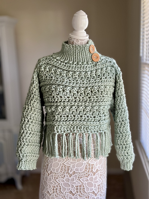 This oversized cropped pullover combines warmth with effortless boho charm. Designed with a ribbed turtleneck, soft textured stitches, and playful fringe along the hem, it’s the perfect layer for chilly days without hiding your style underneath.