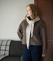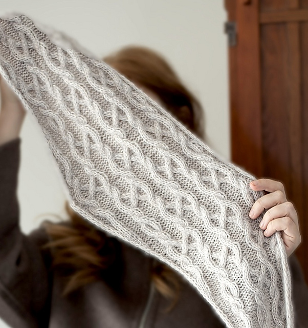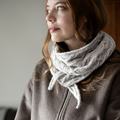 A study in balance and light, this shawl begins at a slender point and unfolds gradually, its cables flowing like braided light across a gentle diagonal. Worked flat from point to point, it grows with measured increases to the center, then recedes in mirrored decreases to close the form.