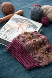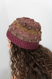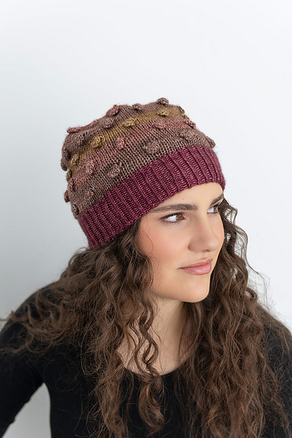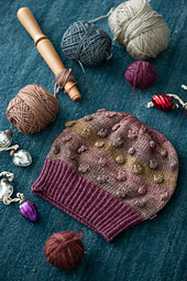 Knit in DK weight scraps or mini skeins, the Trinket Hat gathers its colours like a handful of treasures. Stripes build up in a soft, satisfying rhythm, while cheerful bobbles add texture and a pop of whimsy. A snug ribbed brim keeps the chill away, and the slightly slouchy shape offers an easy, relaxed fit.