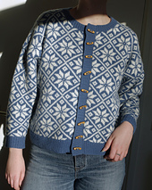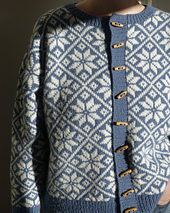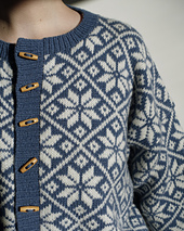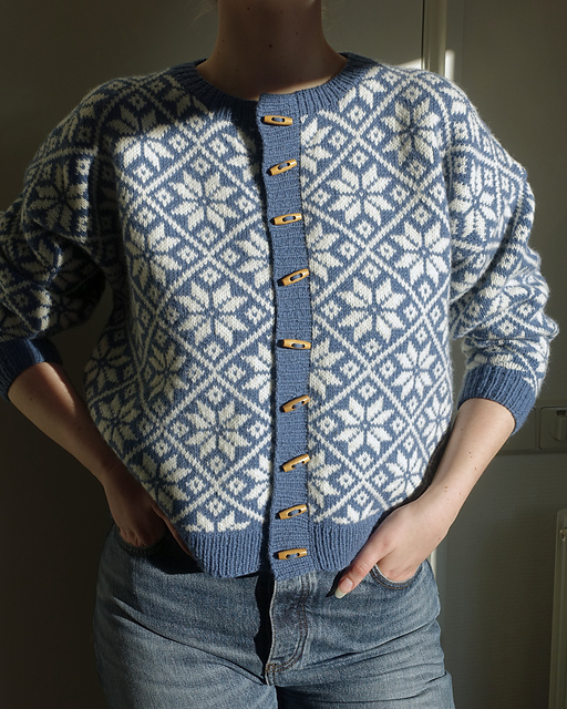 The **Kiruna Cardigan** is an all-over stranded colourwork cardigan, with an 80s inspired oversized fit. The pattern is calculated to have around 30 cm of positive ease, with large sleeves to complement the silhouette. The entire cardigan is knitted in the round and uses steeking to make that possible. The body is worked bottom-up and the sleeves are worked top-down.