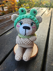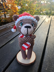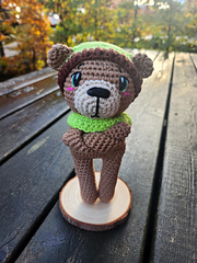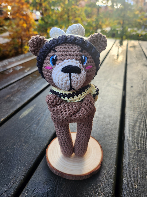 This pattern consists of 8 pages of detailed description in pdf format. There are a lot of photos to help you with the various parts of the bear. The pattern also includes various scarf options and 5 different types of hats, designed to be removable. The pattern includes instructions to make either a sitting or standing version of the bear.