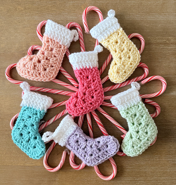 These little stockings are super addictive to make. At just 4 inches tall, they work up super fast with scrap amounts of yarn, so you’ll have a stack of them in no time!