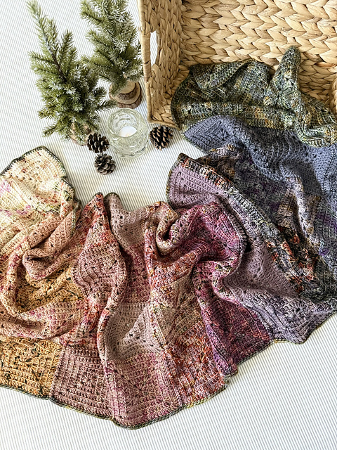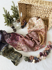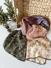 I've made two of these scarves from previous years advents: The pink/purple coloured one is from the 2024 Botanical Advent by Hue Loco Yarn and the blue/green photos are from the 2023 Oxide Advent by Hue Loco.