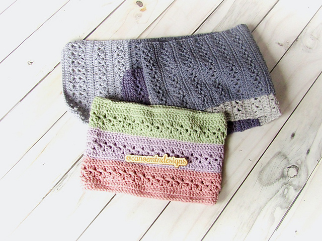 A fun textured design. Cowl is worked in the round, scarf is worked in short rows. Easy row/round repeat. Quick patterns that work well in a solid color or self striping yarn. Great scrap busting patterns.