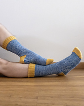 The **Fresnel Socks** are an engaging **toe-up** project worked in playful helical stripes. The **afterthought heel with flap and gusset** ensures a great fit without interrupting the rhythm of the stripes. Worked in two or three colors, it’s a perfect stashbuster. Optional calf shaping and a choice of a standard or doubled cuff let you make the most of your yarn.