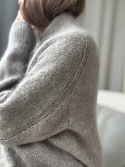 The sweater is worked from top to bottom. First stitches are cast on for the neck, which is worked back and forth with increases on both sides to shape the upper back. Then stitches are picked up along the shoulder edge, and the shoulders are worked individually back and forth – first with short rows and then with increases for the neck. The front piece and back piece are then joined for the body which is worked in the round. The neck stitches are picked up along the neck opening and the neckband is worked in the round in ribbing. Sleeve stitches are picked up around the armhole, and sleeves are worked individually in the round with decreases along the ribbing panel and are then finished with a ribbing edge and Italian bind off.