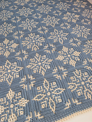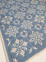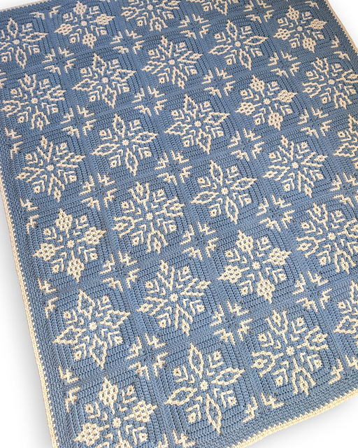 The Winter Whispers Blanket pattern includes five different square designs, each featuring a subtle snowflake/ice crystal motif. The squares are worked from the center outward using the overlay mosaic crochet technique. A beautiful method where you work with one color per round and no yarn floats are visible on the back.