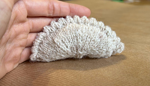 This knit dumpling is knit seamlessly from the center out, beginning with just 8 stitches and expanding through lifted increases to create a round, flat base. After reaching full width, half of the stitches are worked flat to form the folded picot hem. The remaining live stitches are then grafted together with Kitchener stitch to shape the body, with stuffing added as you close the seam. Finally, the picot edge is refined with light seaming and a small embroidered crease.