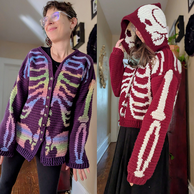 The F*ck AI skeleton sweater comes with two pdfs, with a hooded and cardigan version. Each version can be made as a cropped length or long length sweater. The pattern comes in 3 sizes. When laid flat, their pit to pit measurements are 22", 27" and 33". The pattern contains unique charts for each customization option and size! The pdfs also include notes on how to use Stitch Fiddle and its progress tracker, and advice on blocking your finished item.