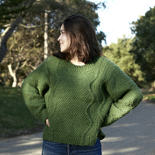 **The Bike Path Sweater is knit top-down with a drop shoulder construction. It features dramatic cabled bike paths, grass-like moss stitch, and unique gradient ribbing at the hems. This pattern has been tech edited and test knit in all sizes. Matching made-to-measure pet sweater pattern included!**
