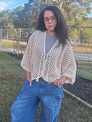 Tassel is optional. To mimic example, weave ends of tassel evenly in front of cardigan, beginning at bottom edge and working upward until half of length is reached.
