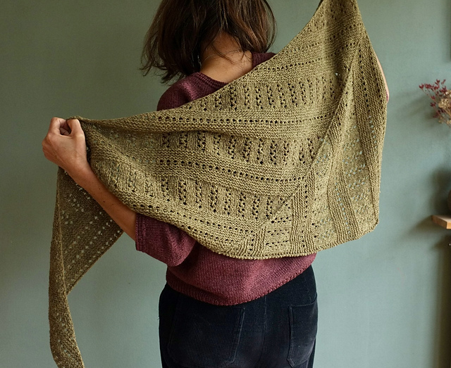 OCA is a scarf/shawl with an unusual construction; it’s knitted sideways, from the right point to opposite side. Its shape is created through a combination of decreases and increases. This, paired with its rhythmic textures, makes it a super fun project to knit, quick to finish, and perfect for holiday gifts!
