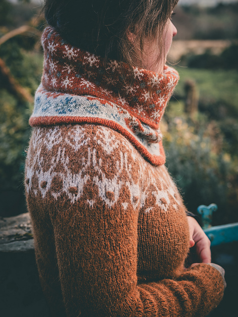 **For DK weight:** 24 sts / 26 rnds on smaller needles and 18 sts / 22 rnds on larger needles per 10 cm / 4 inches in colourwork in the round after washing and blocking
