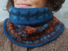 Winter Sky is a colourwork cowl worked in the round. The pattern offers several options – a double-layer cowl with different colourwork motifs on each side in either **DK** OR **fingering weight** yarn, and a single layer cowl in **DK weight**.