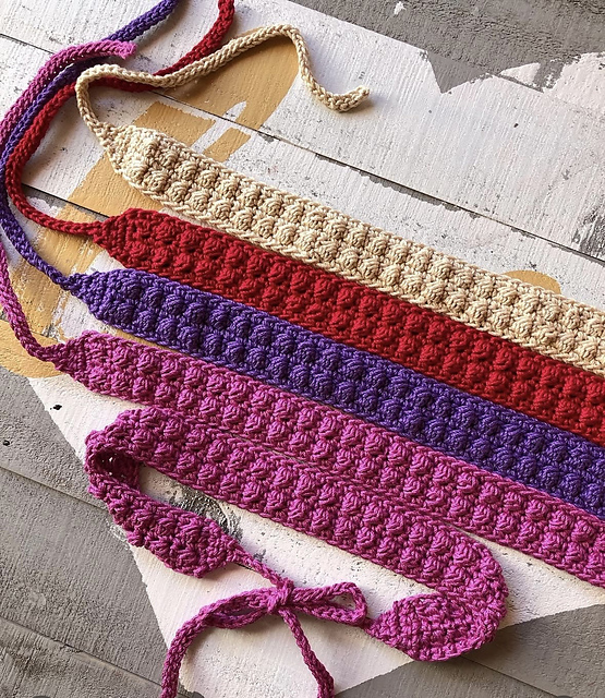 The Strawberry Girl crocheted headband is adjustable, you just tie it to fit your comfort. It’s easy to customize to your preferred size. Just a small amount of #4 worsted cotton yarn is recommended, but any yarn can be used. Gauge is not important as it is a small project and easily adjustable.