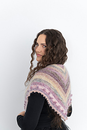 That instinct to save and cherish grew into the Ribbon and Remnants Shawl. Knit from fingering weight yarn scraps or mini skeins held double with a strand of silk mohair, this striped triangular shawl shimmers with softness. Gentle garter-stitch ribbons of colour flow across the shoulders, blended and softened by the airy mohair halo. Playful bobbles add texture at the border, which is finished with a fluttering picot bind-off.