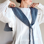 Begin from the back, knit in ribbing while working both ends with I-cord, then separate at the shoulders and shape each front with the German short row, decreasing stitches as it goes, finishing with three I-cords. The three I-cords are braided together and finished at a length that allows them to be tied at the front. In autumn, wear it over your shoulders when the air turns slightly chilly. In winter, it is recommended to choose colors that stand out beautifully against dark-colored outerwear.
