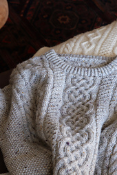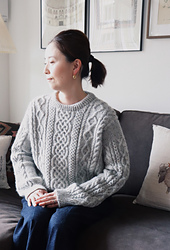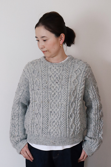 **Hoff Aran Sweater** is a drop-shoulder sweater featuring classic Aran patterns.